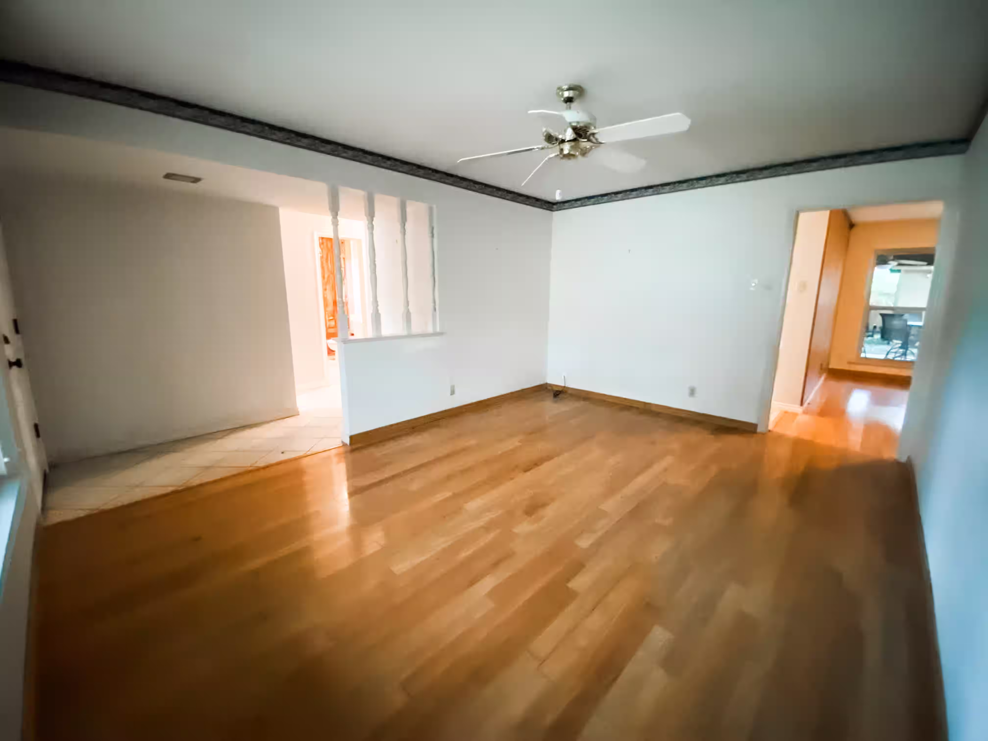 Worn finishes, old flooring, and dated paint make the whole house feel tired
